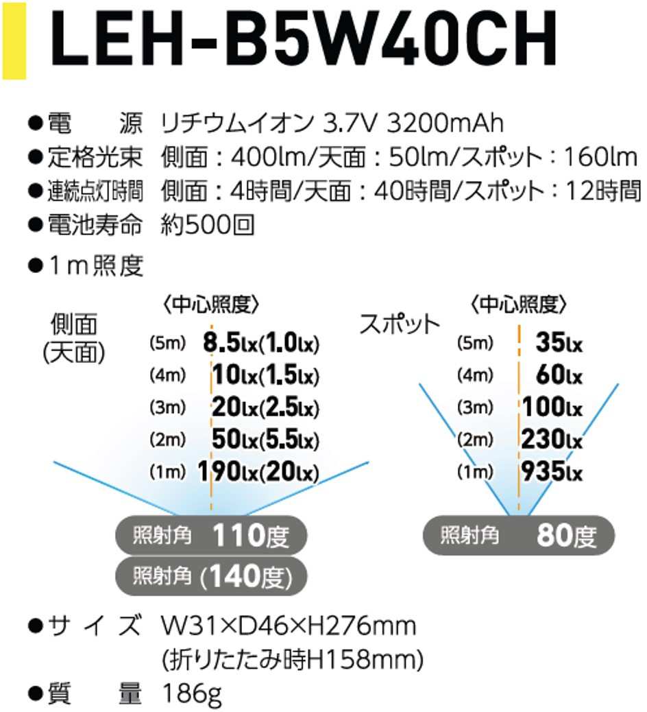 | 容量 | ■内容:ジャックランプ×1 ■型式:LEH-B5W40CH ■LEDワット数:5W ■サイズ:W31mm×D46mm×H276mm(折りたたみ時/H130mm) ■質量:186g ■仕様:屋内用 ■光源色:昼光色 ■演色性:天面・側面:Ra85(高演色LED) ■充電電源:DC5V/2Aまで ■球寿命:50000時間 ■使用環境温度:使用時/-10℃から40℃まで、充電時/0℃から45℃まで ■電源:リチウムイオン3.7V 3200mAh ■定格光束(lm):側面/400、天面/50、スポット/160 ■連続点灯時間:側面/4時間、天面/40時間、スポット/12時間 ■電池寿命:約500回 ■1m照度(lx):天面/20、側面/190、スポット/935 ■付属品:USBケーブル(Type-C) |