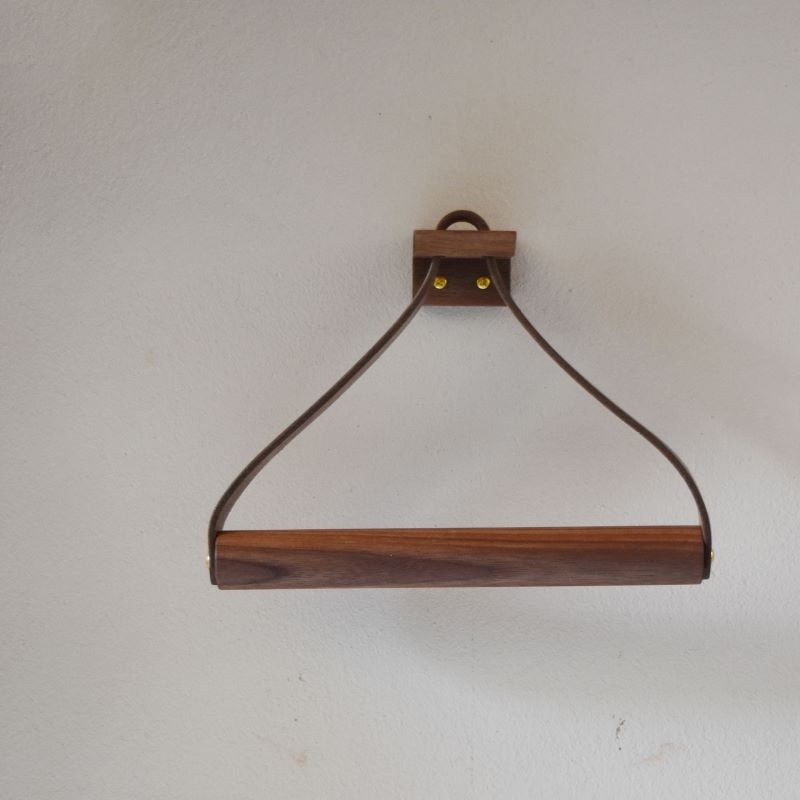 ウォールナット、国産のヌメ革、真鍮を組み合わせたタオルホルダー