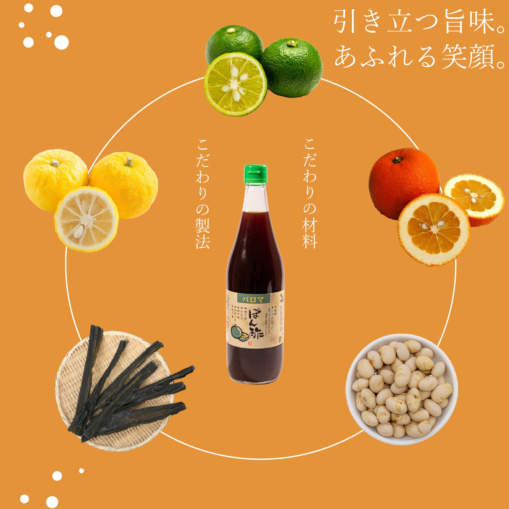 | 容量 | ▼下記の個数よりお選びいただけます▼ 味付けポン酢720ml 1本 / 2本 製造地:すべて大阪府松原市 ■原材料 柑橘果樹(ゆず・だいだい・すだち)、醤油(国内製造)、鰹だし(砂糖・異性化液糖、食塩、かつおエキス、その他)、みりん、砂糖類(ぶどう糖果糖液糖、砂糖)、醸造酢、昆布エキス、たん白加水分解物、食塩/調味料(アミノ酸等)、酒精、酸味料、V.C、カラメル色素、(一部に小麦・大豆を含む) |