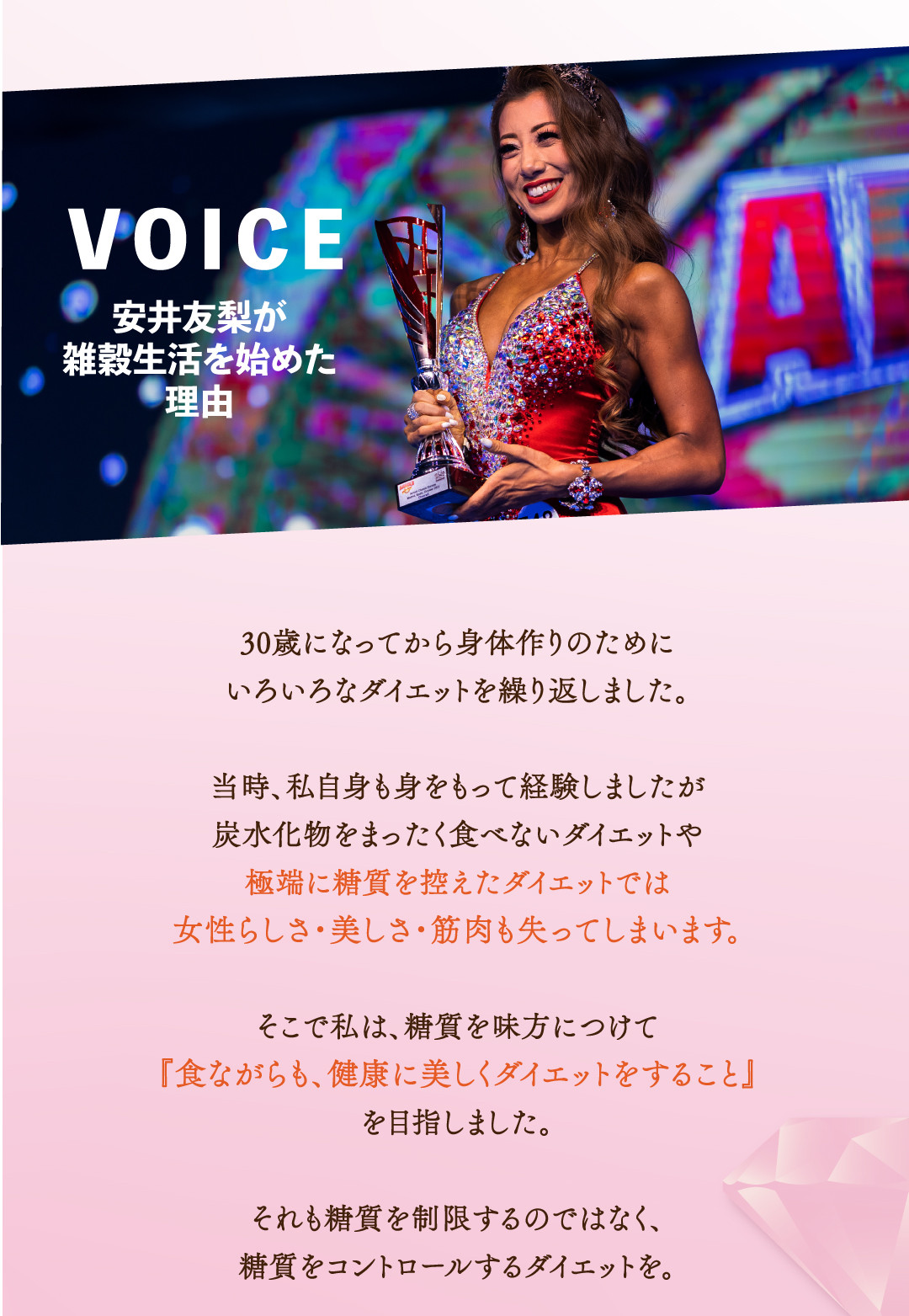安井友梨監修の黒美米は、安井がフィットネス競技挑戦の中で培った知識や想いにもとづいて作られました。