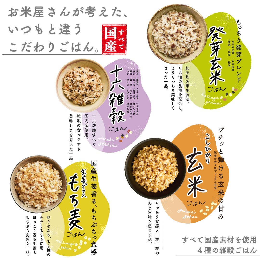 健康や美容を気にして白米を遠ざける人が増えていますが、 お米の良さを知っている米屋だからこそ 手軽で罪悪感のないおいしいごはんを食べて頂きたいと 4種類の雑穀ごはんを開発いたしました。しかしながら白米に比べて栄養の優れた雑穀は少し癖があり、 食べにくいという印象を持たれている方も少なくありません。そこでこの商品は『食べやすさ』を追求し雑穀を厳選。 またすべて国産素材を使用しているので安心してお召し上がり頂けます。