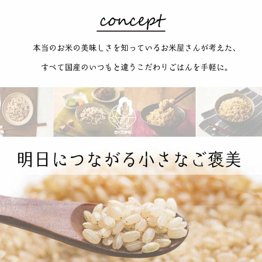 健康や美容を気にして白米を遠ざける人が増えていますが、 お米の良さを知っている米屋だからこそ 手軽で罪悪感のないおいしいごはんを食べて頂きたいと 4種類の雑穀ごはんを開発いたしました。しかしながら白米に比べて栄養の優れた雑穀は少し癖があり、 食べにくいという印象を持たれている方も少なくありません。そこでこの商品は『食べやすさ』を追求し雑穀を厳選。 またすべて国産素材を使用しているので安心してお召し上がり頂けます。