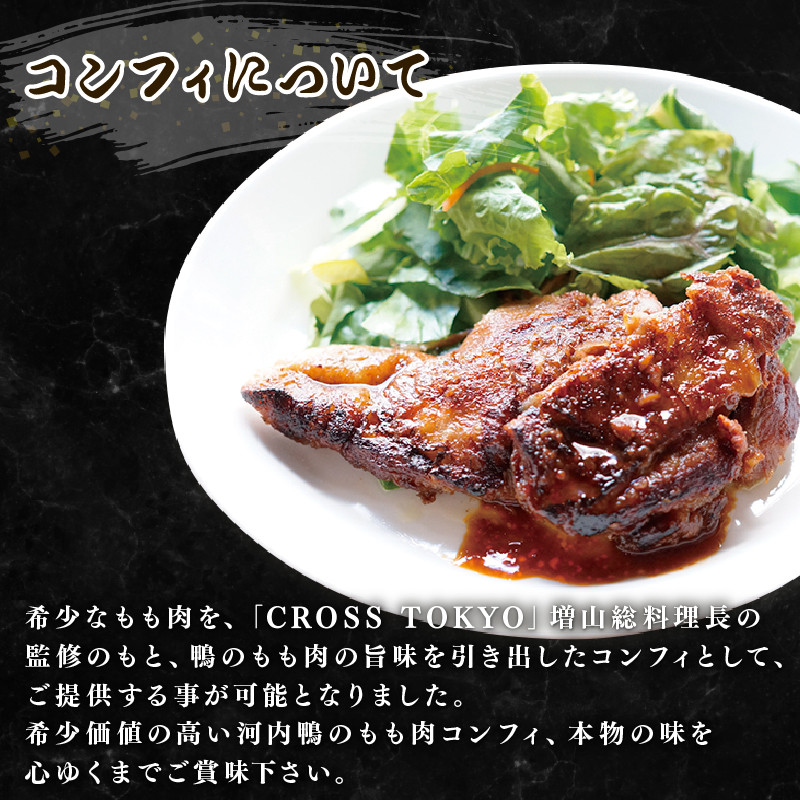 河内鴨コンフィは稀少なもも肉を、「CROSS TOKYO」増山総料理長の監修のもと、鴨のもも肉の旨味を引き出したコンフィとして、ご提供する事が可能となりました。