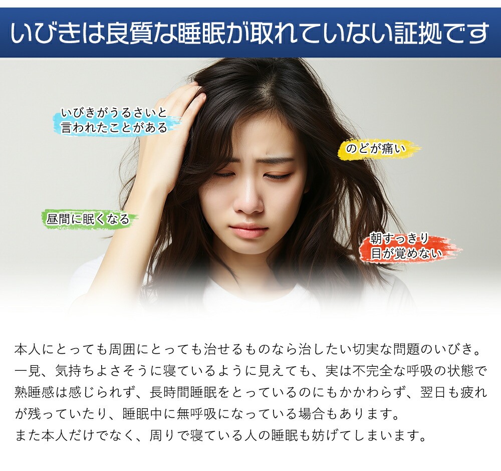 いびきは睡眠時に舌根や軟口蓋が重力の影響などでノドに落ち込み、上気道を狭めることによって生じる粘膜の振動音です。