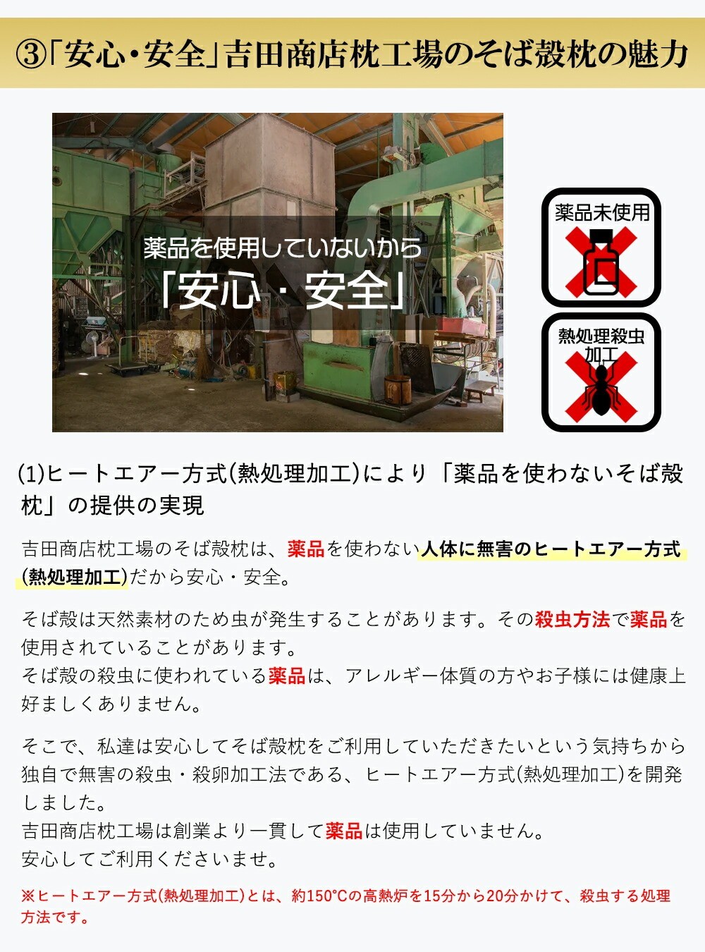 最近では、ウレタンなどの枕が台頭してきたことや、そばアレルギーの問題で使われる方が減少していますが、通気性が良く、そば殻独特の感触や匂いが好みの方からは根強い人気があります。この方々にとっては、そば殻に変わる素材はないと思われます。