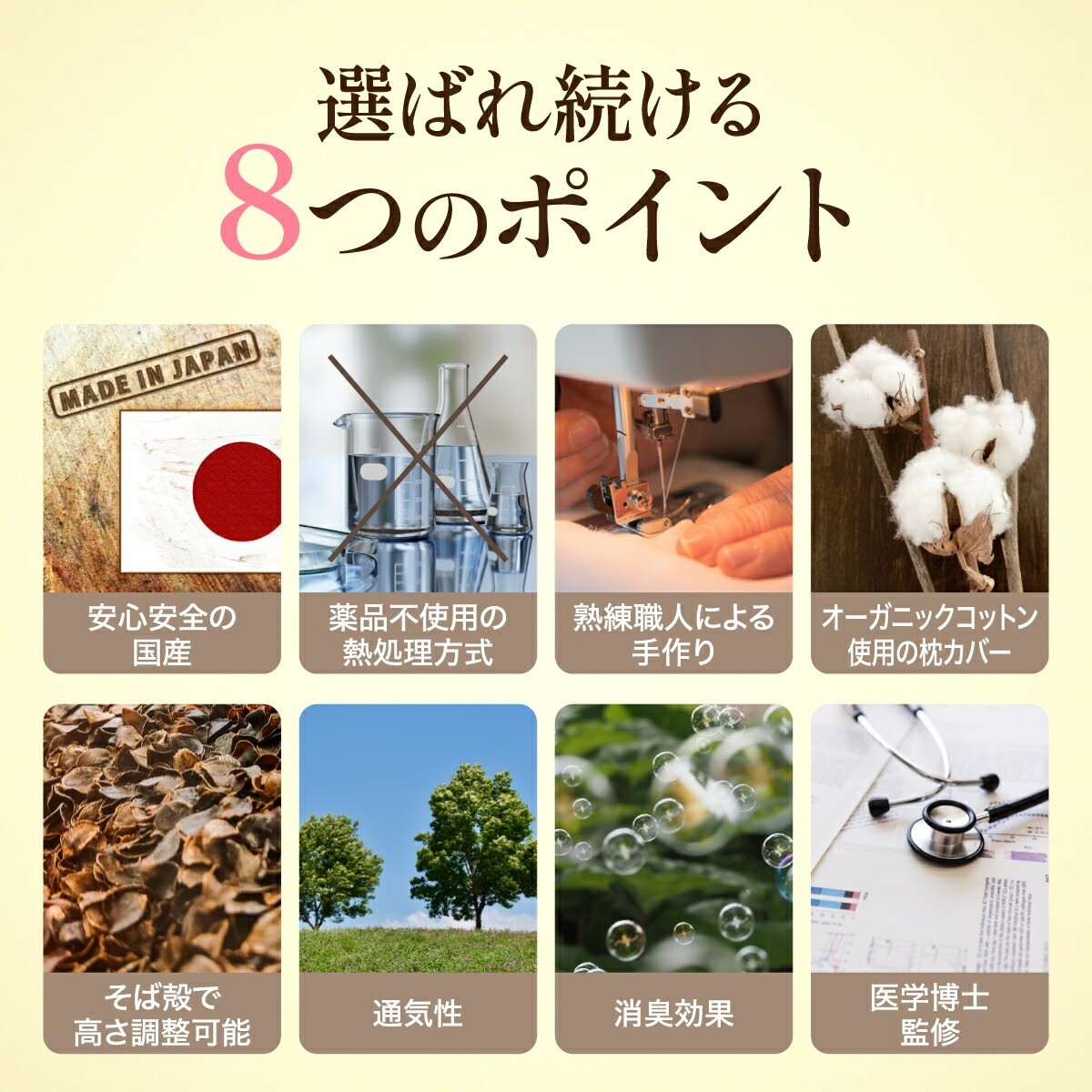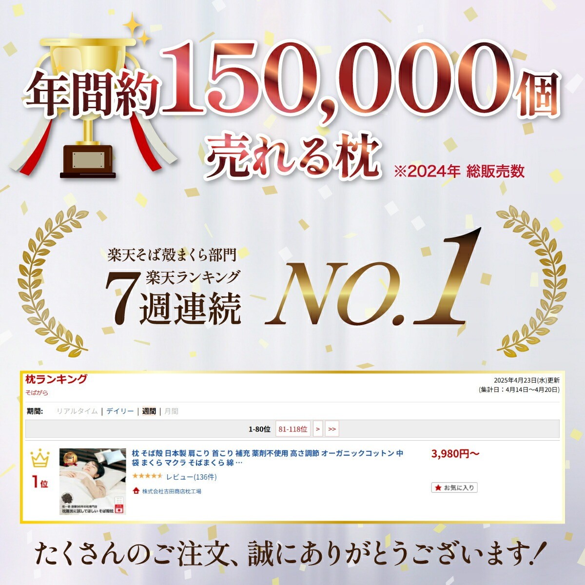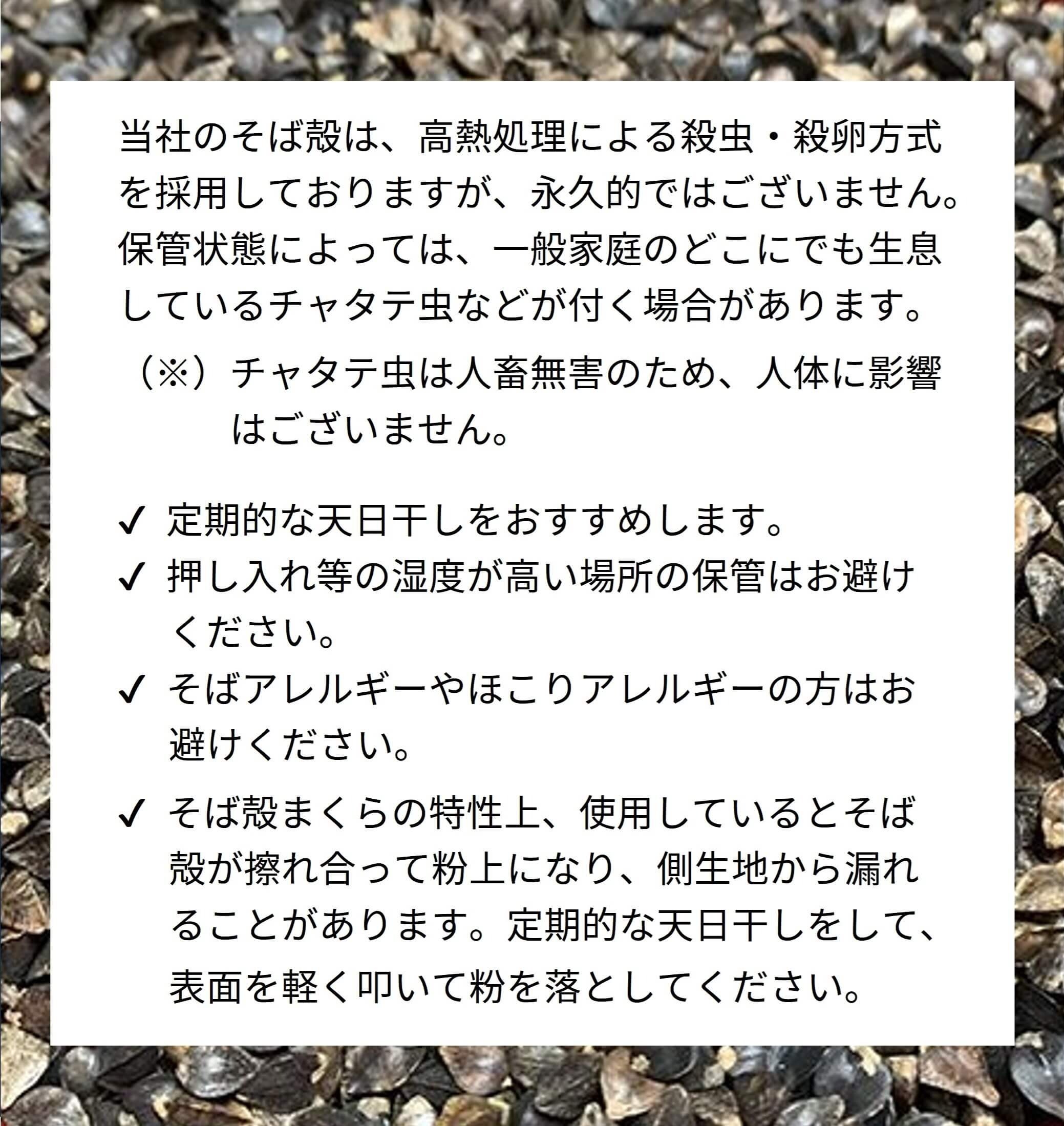 最近では、ウレタンなどの枕が台頭してきたことや、そばアレルギーの問題で使われる方が減少していますが、通気性が良く、そば殻独特の感触や匂いが好みの方からは根強い人気があります。この方々にとっては、そば殻に変わる素材はないと思っています。