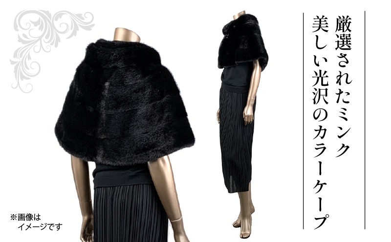 光沢の美しいミンクファーを使用したダブルスタンドカラーのケープは、襟を二重構造にすることで自然なボリュームを演出。上品で華やかな印象を与えるデザインが、装う人の気品を一層引き立てます。