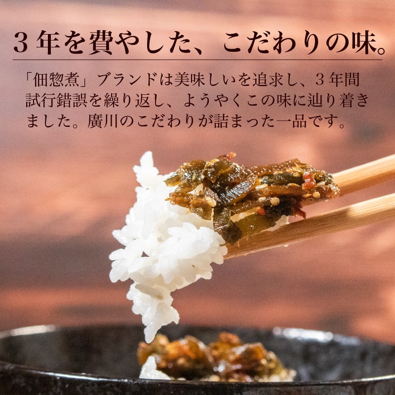 明治35年より伝え引き継いだ独自製法「直火釜炊き製法」は、調味液を余すことなく食材に味を入れ込む製法です。 炊きあがった商品には、煮汁がほとんどなく炊きあがります。 その商品を贈答用のブランドとして販売しているのが、「廣川昆布」ブランドです。 創業の地である広島県福山市から大阪府大阪市へ、そして現在の松原市に本社工場が移り変わりました。 松原市で60年以上佃煮を作り続けています。 「しその実わかめ」平成26年第62回全国水産加工たべもの展 大阪府知事賞 受賞した、しその実がピリっと効いた食感の良いワカメの茎部分を佃煮にした商品です。 「ちりめん鰹昆布」平成28年第63回全国水産加工たべもの展 農林水産大臣賞 受賞した、枕崎のかつお、小豆島の生揚醤油などこだわったものを使い、甘辛く炊き上げた商品です。 「椎茸入甘煮わかめ」平成30年第64回全国水産加工たべもの展 大阪府知事賞 受賞した、椎茸と茎わかめの触感を大切に甘辛く炊いた商品です。 「鰹入わかめ昆布」令和2年 第65回全国水産加工たべもの展 大阪府知事賞 受賞した、かつおの旨味とコリコリとした触感の良い茎わかめ、そして昆布の3種類を合わせて炊いた商品です。 【使用方法】 開封後は常温保存可能ですが、お早めにお召し上がり下さい。 【保存方法】 直射日光・高温多湿を避けて保存して下さい 【注意事項】 ※画像はイメージです ※予告なくパッケージが変更になる場合がございます