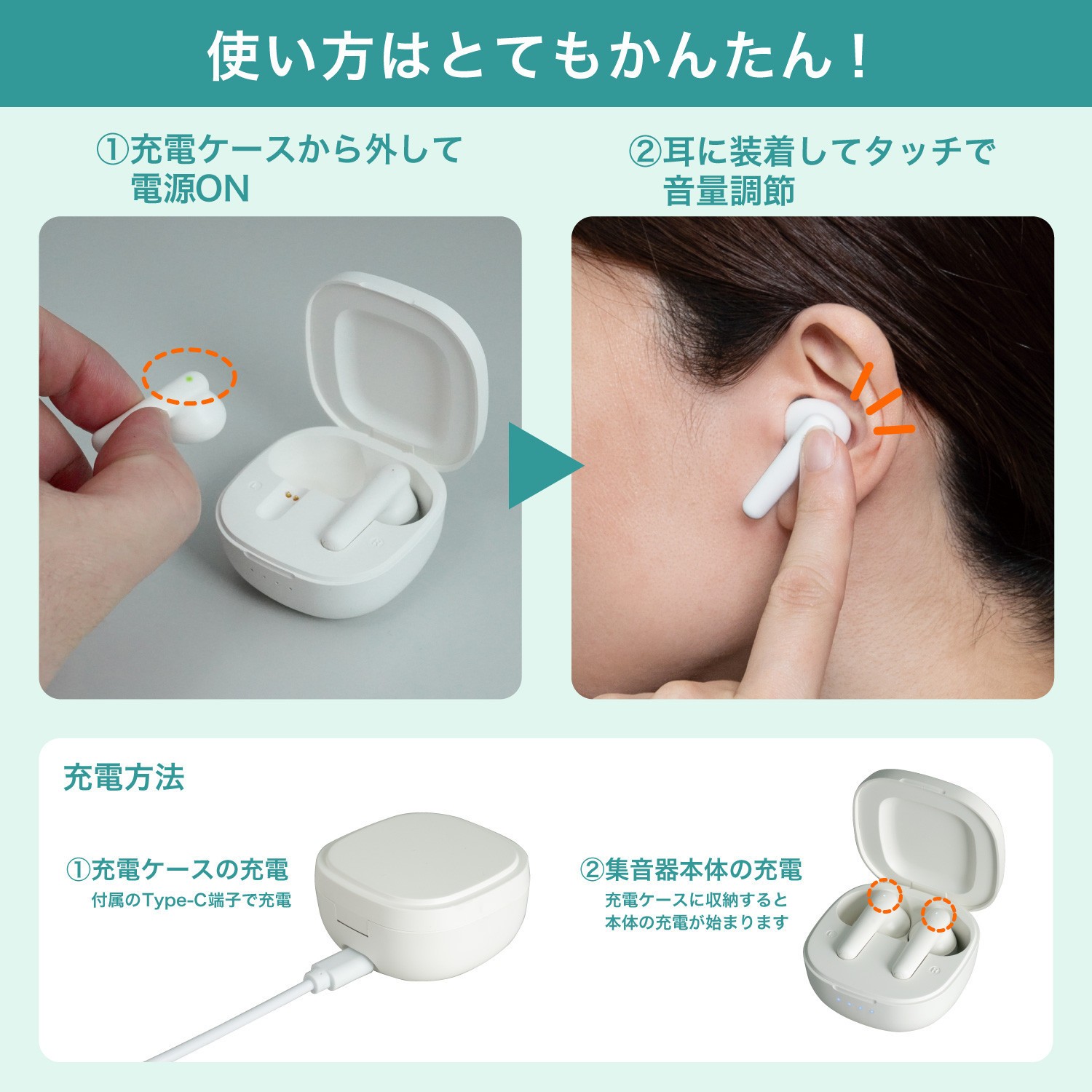 | 容量 | ■電源:集音器本体 充電式リチウムイオン電池 3.7V 25mAh 充電ケース 充電式リチウムイオン電池 3.7V 300mAh ■連続使用時間:約30時間 ※満充電時、ボリューム最大時 ■充電時間:集音器本体 約2時間 充電ケース 約2時間 ※使用期間や使用環境により、充電時間や連続使用時間は短くなる場合があります。 ■ボリューム:音量調整5段階 ■外形寸法(約):集音器本体 高さ36mmx幅23mmx奥行20mm 充電ケース 高さ54mmx幅30mmx奥行54mm ■質量(約):集音器本体(片耳) 4g 充電ケース 38g ■セット内容:集音器本体、充電ケース、USBケーブル、ACアダプター、イヤーピースSML各2 ※ご購入時はMサイズが集音器本体に取り付けられています、クリーニングブラシ、収納ポーチ、取扱説明書、簡単マニュアル |