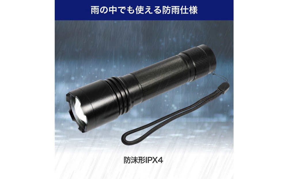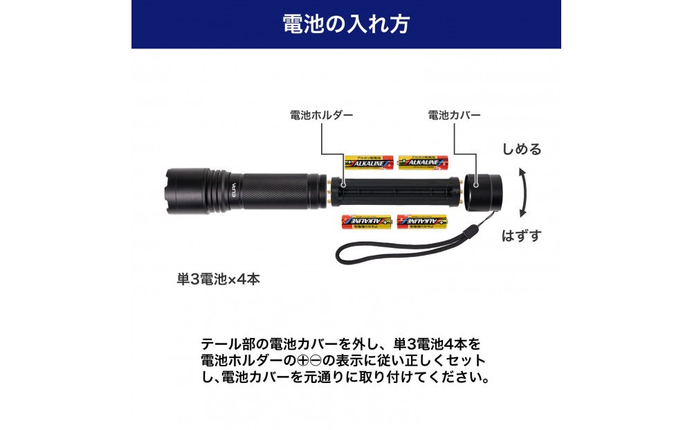 | 容量 | ■使用電池:単三形アルカリ乾電池×4本(別売) ■連続点灯時間:HI 約2時間 /MID 約5時間 /LOW 約20時間/点滅 約2時間 *アルカリ乾電池使用時 *電池の性能、使用条件により連続点灯時間は短くなる場合があります。 ■光源:白色COB LED×1灯 ■明るさ:本体 散光 HI 約1500lm MID 約700lm LOW 約150lm、集光 HI 約600lm MID 約300lm LOW 約60lm ランタンカバー装着時 散光 HI 約1100lm MID 約500lm LOW 約100lm *アルカリ乾電池初期時 ■外形寸法(約): ・ランタンカバー装着時:直径51×全長229(mm)(最大値) ・本体:直径44×全長170(mm)(最大値) ・ランタンカバー:直径51×全長68(mm)(最大値) ■質量:本体 約177g(電池除く)、ランタンカバー 約32g ■防 水 仕 様:IPX4(防沫形) *ランタンカバー装着時、ランタンカバー(内に水が侵入する場合があります。) ■付 属 品:ストラップ、ランタンカバー |