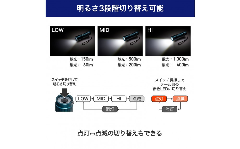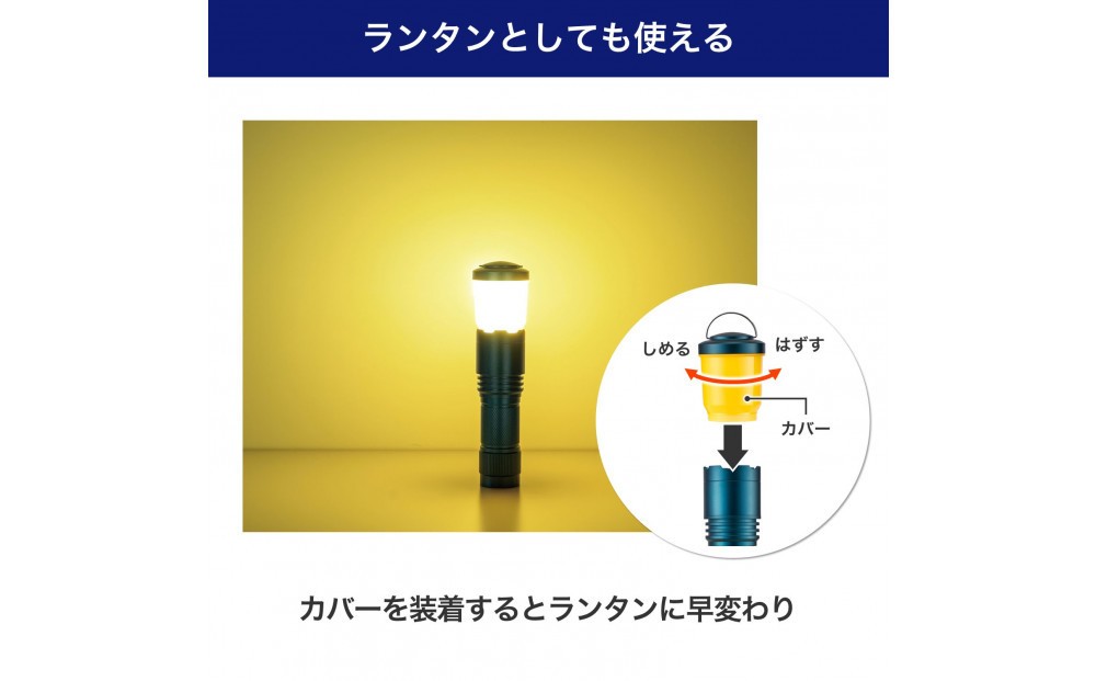 | 容量 | ■使用電池:単三形アルカリ乾電池×3本(別売) ■連続点灯時間:HI 約3時間/MID 約6時間/LOW 約40時間/点滅 約7時間/赤色点灯 約17時間/赤色点滅 約40時間 *アルカリ乾電池使用時 *電池の性能、使用条件により連続点灯時間は短くなる場合があります。 ■光源:白色COB LED×1灯+赤色LED×8灯 ■明るさ:本体 散光 HI 約1000lm MID 約500lm LOW 約150lm、集光 HI 約400lm MID 約200lm LOW 約60lm ランタンカバー装着時 散光 HI 約700lm MID 約350lm LOW 約100lm *アルカリ乾電池初期時 ■外形寸法(約): ・ランタンカバー装着時:直径51×全長198(mm)(最大値) ・本体:直径44×全長139(mm)(最大値) ・ランタンカバー:直径51×全長68(mm)(最大値) ■質量:本体 約175g(電池除く)、ランタンカバー 約32g ■防 水 仕 様:IPX4(防沫形) *ランタンカバー装着時、ランタンカバー(内に水が侵入する場合があります。) ■付属品:ストラップ、ランタンカバー |