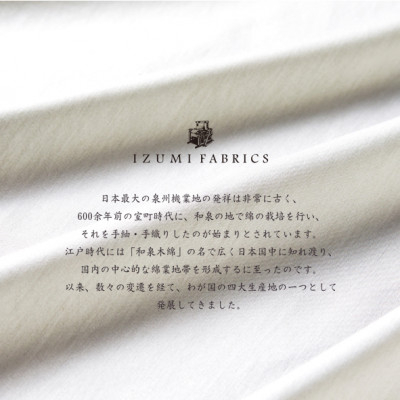 たては80番手、横には100番手という細くて柔らかい超長綿糸(ユニチカ「ラムコ」)を、和泉市内の工場で丁寧に織り上げました。抗菌防臭加工SEKマーク取得の生地です。