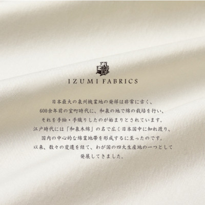 たては80番手、横には100番手という細くて柔らかい超長綿糸(ユニチカ「ラムコ」)を、和泉市内の工場で丁寧に織り上げました。抗菌防臭加工SEKマーク取得の生地です。