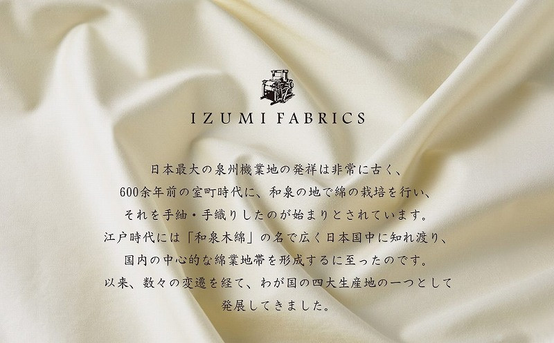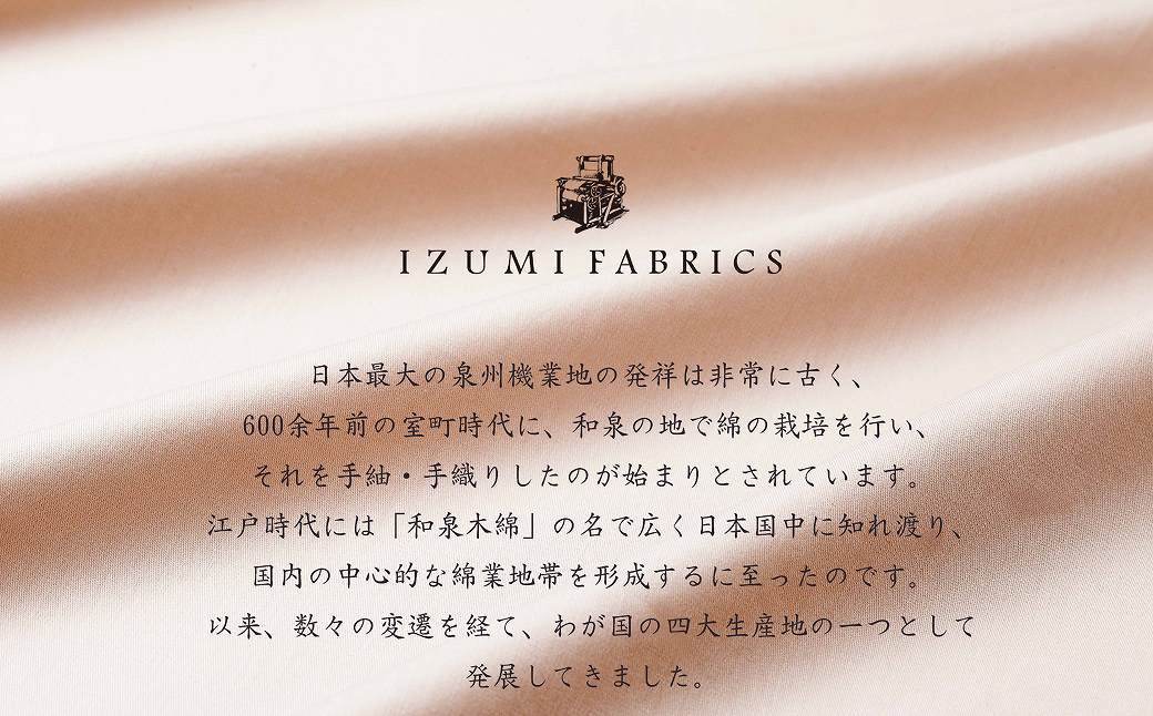 側生地には 細くて柔らかい60番手の超長綿(ユニチカ「ラムコ」)を和泉市内の工場で織り上げた、軽くて柔らかな肌触りの高級生地を使用しました。