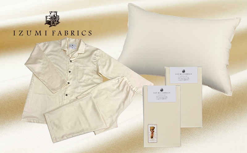 心地よい睡眠のために 羽毛枕、イズミファブリックスやわらか超長綿糸を使用した枕カバーと、共布のパジャマをセットにしてお届けします。