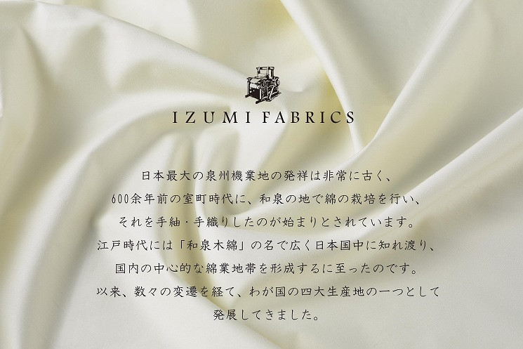 側生地には、細かくて柔らかい100番手の超長綿(ユニチカ[ラムコ/RAMCO」)を和泉市内の工場で織り上げました。抗菌防臭加工SEKマーク取得の生地です。