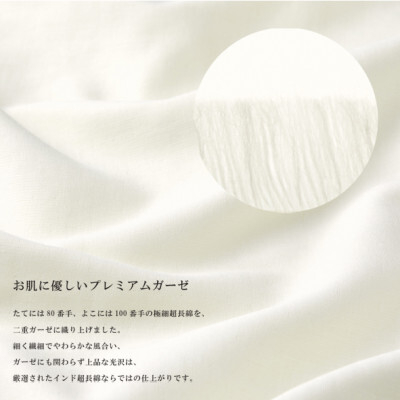 たてには80番手、よこには100番手の極細超長綿を、二重ガーゼに織り上げました。細く繊細でやわらかな風合い、ガーゼにも関わらず上品な光沢は、厳選されたインド超長綿ならではの仕上がりです。抗菌防臭加工SEKマーク取得の生地です。