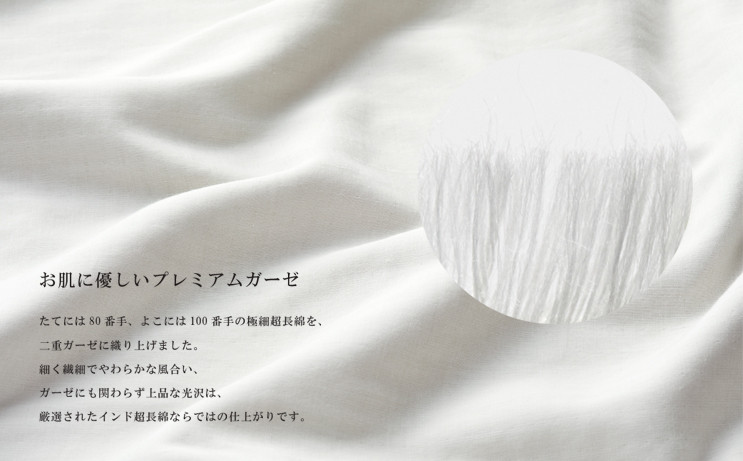 たては80番手、よこには100番手という細くて柔らかい超長綿糸(ユニチカ「ラムコ/RAMCO」)を和泉市内の工場で二重ガーゼに織り上げました。