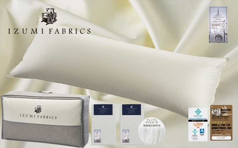 | 容量 | ■お礼品の内容について ・ダウンピロー[50×150cm×1個] 加工地:和泉市 ・ピローケース[約50×150cm×2枚] 加工地:和泉市 ■原材料・成分 ダウンピロー(50×150cm) 材 質:綿100%(100番手超長綿) 詰 物:ダウン93%・フェザー7%(ハンガリー産ホワイトグース) 詰物重量:1.25kg 生産国:日本製 ピローケース×2枚 サイズ:約50×150cm 材 質:綿100%(たて糸80番手、横糸100番手極細超長綿) カラー:プラチナグレー 生産国:日本製 【枕カバー】 (イズミファブリックスやわらか超長綿) たては80番手、よこには100番手という細くて柔らかい超長綿糸(ユニチカ「ラムコ/RAMCO」)を、和泉市内の工場で二重ガーゼに織り上げました。 抗菌防臭加工SEKマーク取得の生地です。 〈ハイブリッドインディアンコットン-ユニチカ「ラムコ/RAMCO」〉 ハイブリッド技術で栽培された原綿を使用。 その独特の光沢、風合いは、まさにインド綿のトップクラス。 ユニチカで長年培った技術、品質管理方法を細かく指導し、異繊維を徹底除去。 気品ある綿素材をお届けいたします。 |
