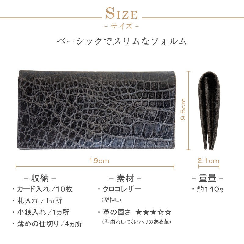 立体感のあるワニ革模様に仕上げたクロコダイルエンボスレザーで作ったロングウォレットです。