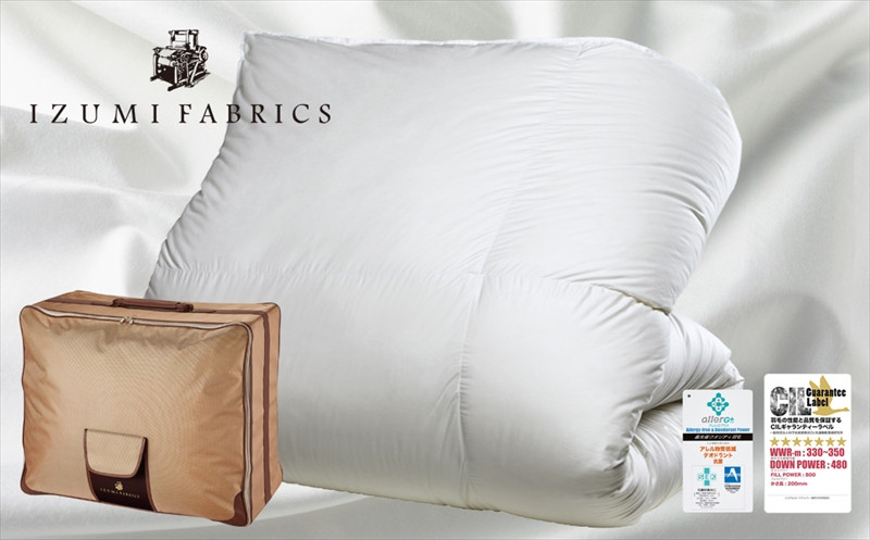 側生地には 厳選された極細超長綿320番精紡交撚糸を和泉市内の工場で織り上げた、美しい光沢と優しいタッチを持つしなやかで軽い高級ふとん用生地を使用しました。