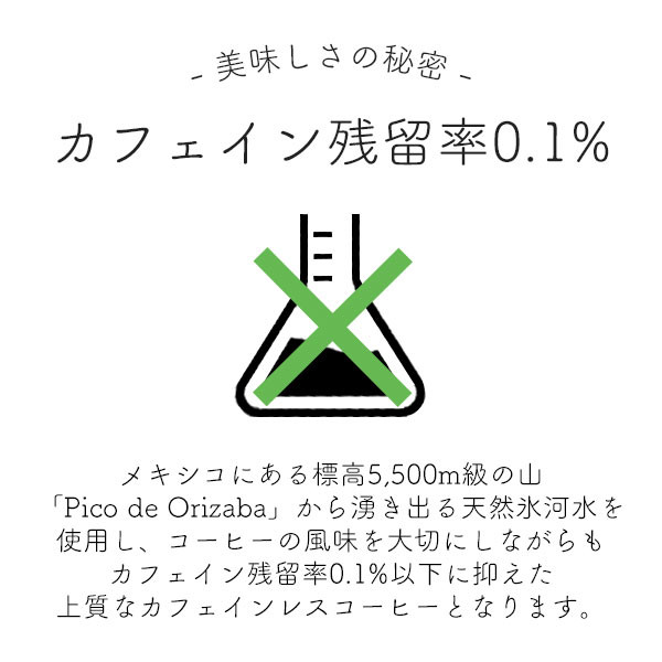 良質なコロンビア産のアラビカ種コーヒー豆を100%使用した、香味ともにご満足いただけるカフェインレスコーヒーです。