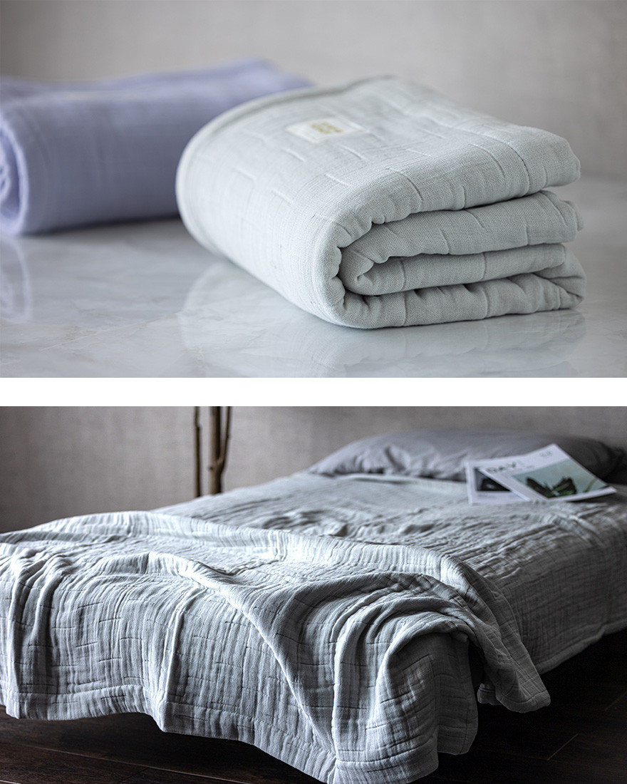 8重に織ったガーゼがたっぷりと空気を含んでおり、余分な湿気を逃がしつつ体温を一定に保ってくれます。