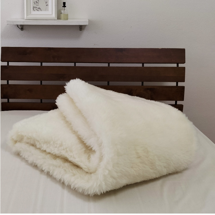 良質なオーストラリア産の天然羊毛を高密度に編み込んだ、まるでムートンのような弾力と風合いの敷毛布。