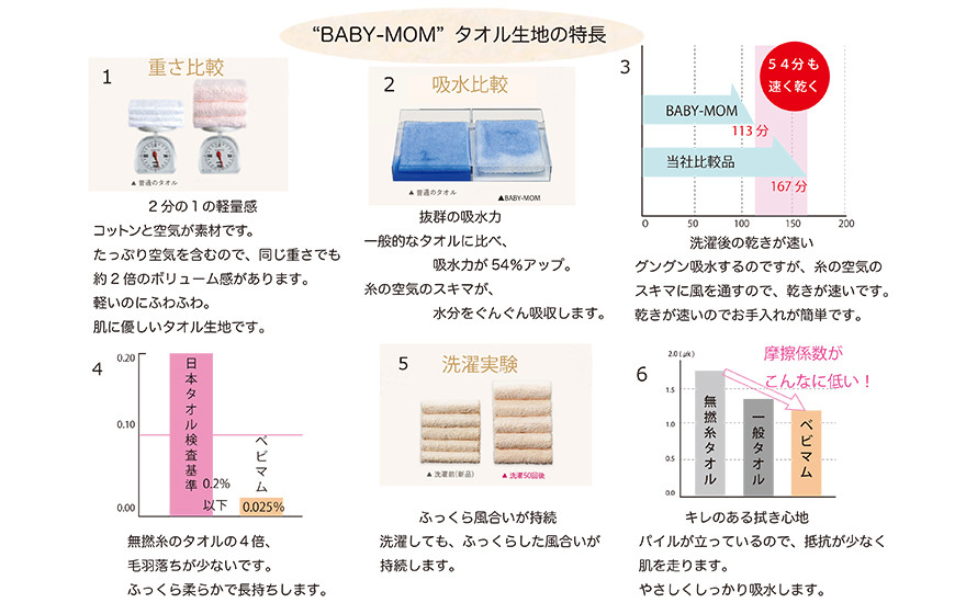 話題のスーパーゼロの糸を使用した、赤ちゃんの為に作られたBABY-MOMタオルを使用しております。