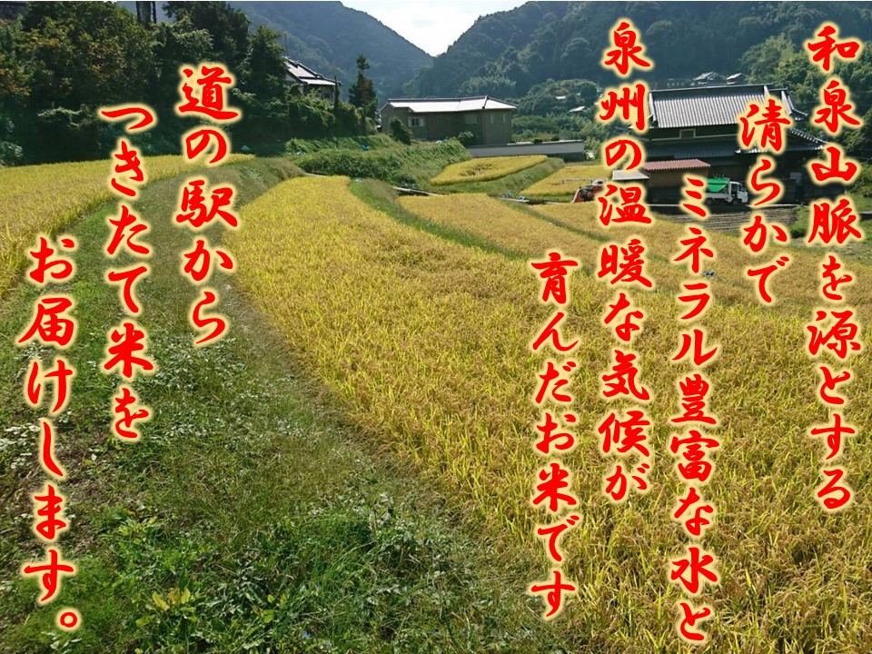 和泉山脈を源とする清らかでミネラル豊富な水と泉州の温暖な気候が育んだお米です。注文を受けてから、道の駅で精米してお届けしますので、搗きたての味をお楽しみいただけます。
