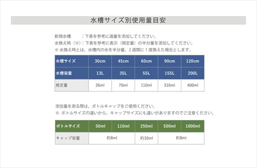 飼育水50Lに対して1本を目安に水槽内またはろ過フィルターに直接添加してください。