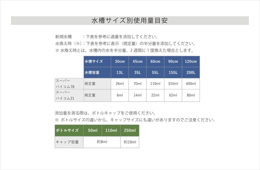 | 容量 | ■お礼品の内容について ・スーパーバイコムスターターキット 淡水用[250ml] 製造地:大阪府和泉市 |