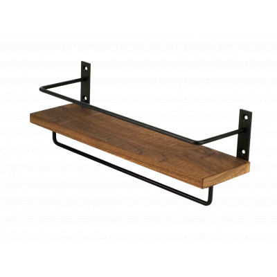 黒皮アイアンと無垢木材の組み合わせで男臭いイメージを払拭したデザインとなっています。また、落下防止バーや下部ハンガー棒により使い勝手も十分に考えられていて実用性も上々です。下地材に直接ネジを打って固定します。ラック下部はタオルハンガーや小道具掛けとして使用できます。
