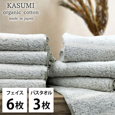 <フェイス6枚バス3枚組>オーガニックコットンフェイスタオル&バスタオルセット かすみグリーン【1517767】