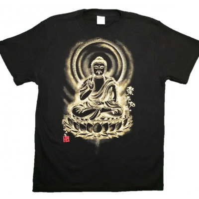 Tシャツに仏画イラストを手刷りした後、独自の技法にて1枚ずつ筆で動きをつけました。
