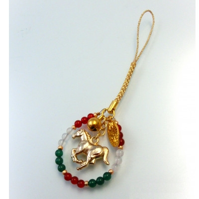縁起がよい金馬のモチーフに健康健脚、無病息災、厄除の御利益の馬(午)のモチーフの根付ストラップ。午(うま)は、勢いよく駆け抜けるイメージから、躍動感、力強さ、活力、健康、行動力や決断力、前向きな姿勢、勝利を象徴し、古来より「神霊の乗物」とされ珍重されてきました。今回、健康長寿、夫婦円満のメノウをぐるりと一周取り巻き、開運厄除け御守り小判や古来より魔よけの力があるとされる鈴も取り付けました。材質:赤めのう、白めのう、緑めのう、合金(金色仕上げ)、ポリエステル 全長約12cm