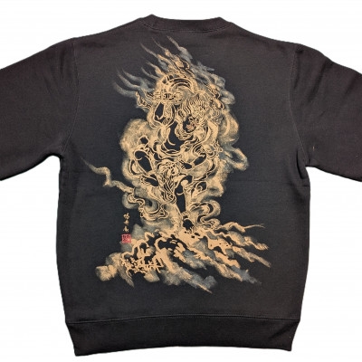 トレーナー(裏起毛)に仏画イラストを手刷りした後、独自の技法にて1枚ずつ筆で動きをつけました。