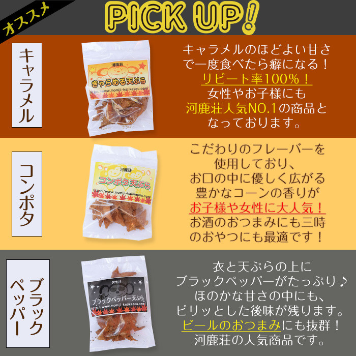 | 容量 | もみじの天ぷら詰め合わせ(合計5袋・5種×各1袋) ・プレーン ・ブラックペッパー ・キャラメル ・コンポタ ・ハニーバター ※1袋あたり20g |