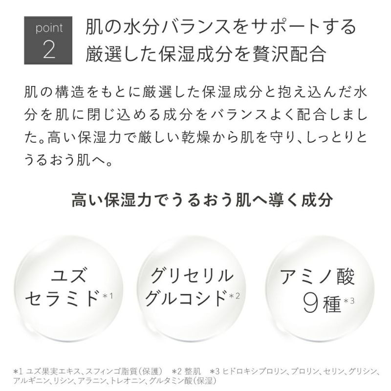 *1 年齢に応じた保湿、ハリのお手入れ *2 ユビキノン(整肌) *3 ヒト遺伝子組換オリゴペプチド-1(整肌) *4 整肌 *5 保湿