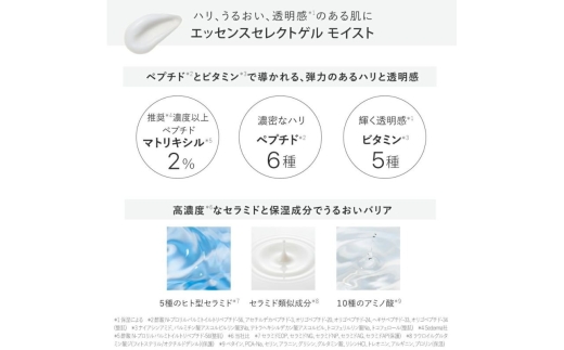 *1 年齢に応じた保湿、ハリのお手入れ *2 酢酸N-プロリルパルミトイルトリペプチド-56(整肌) *3 当社比 *4 酢酸N-プロリルパルミトイルトリペプチド-56、アセチルデカペプチド-3、オリゴペプチド-20、オリゴペプチド-24、ヘキサペプチド-33、オリゴペプチド-34(整肌) *5 角層まで *6 セラミドEOP、セラミドNG、セラミドNP、セラミドAG、セラミドAP (保護)