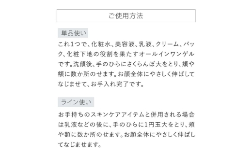 また、長時間続くうるおいとエモリエント感により、物足りなさを感じないゲルが肌に馴染み、時間を味方につけてゆっくりと過ごしていただくために、これ1つで手抜き感のないハリに満ちたツヤ肌へと導きます。