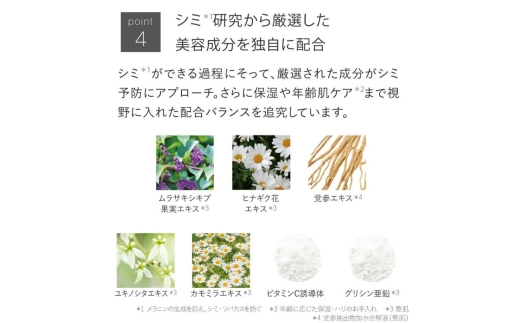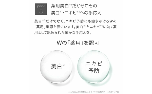 *1 L-アスコルビン酸リン酸エステルナトリウム(有効成分) *2 当社比 *3 メラニンの生成を抑え、シミ・ソバカスを防ぐ *4 日焼けによる *5 ニキビ予防 *6 乾燥・キメの乱れによる