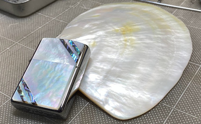 柏原市の貝釦職人が、天然の白蝶貝とメキシコアワビを削り出し、鎧(アーマー)ZIPPOに全て手作業で加工しています。