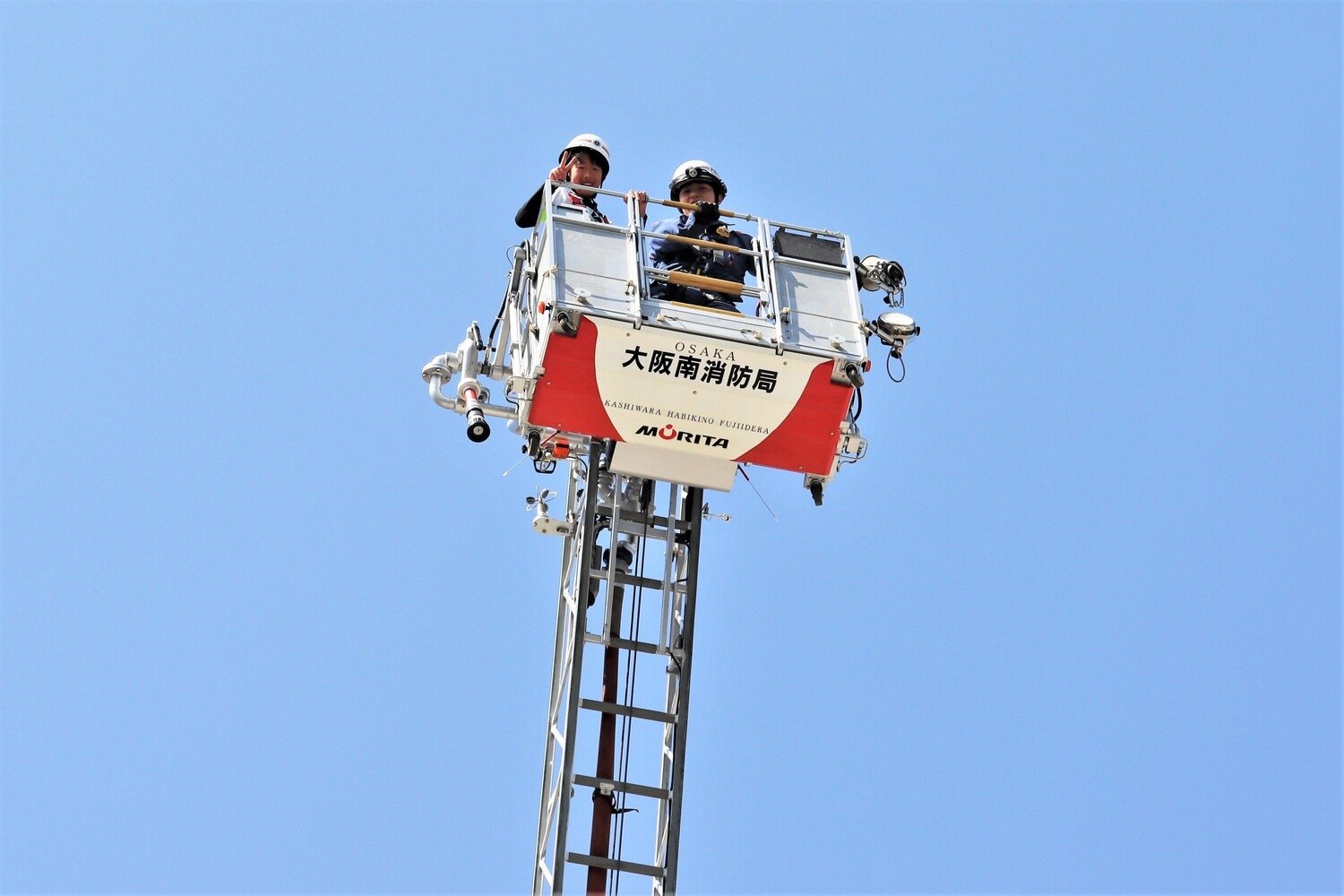 はしご車バスケット搭乗体験は同乗者1名可能です。