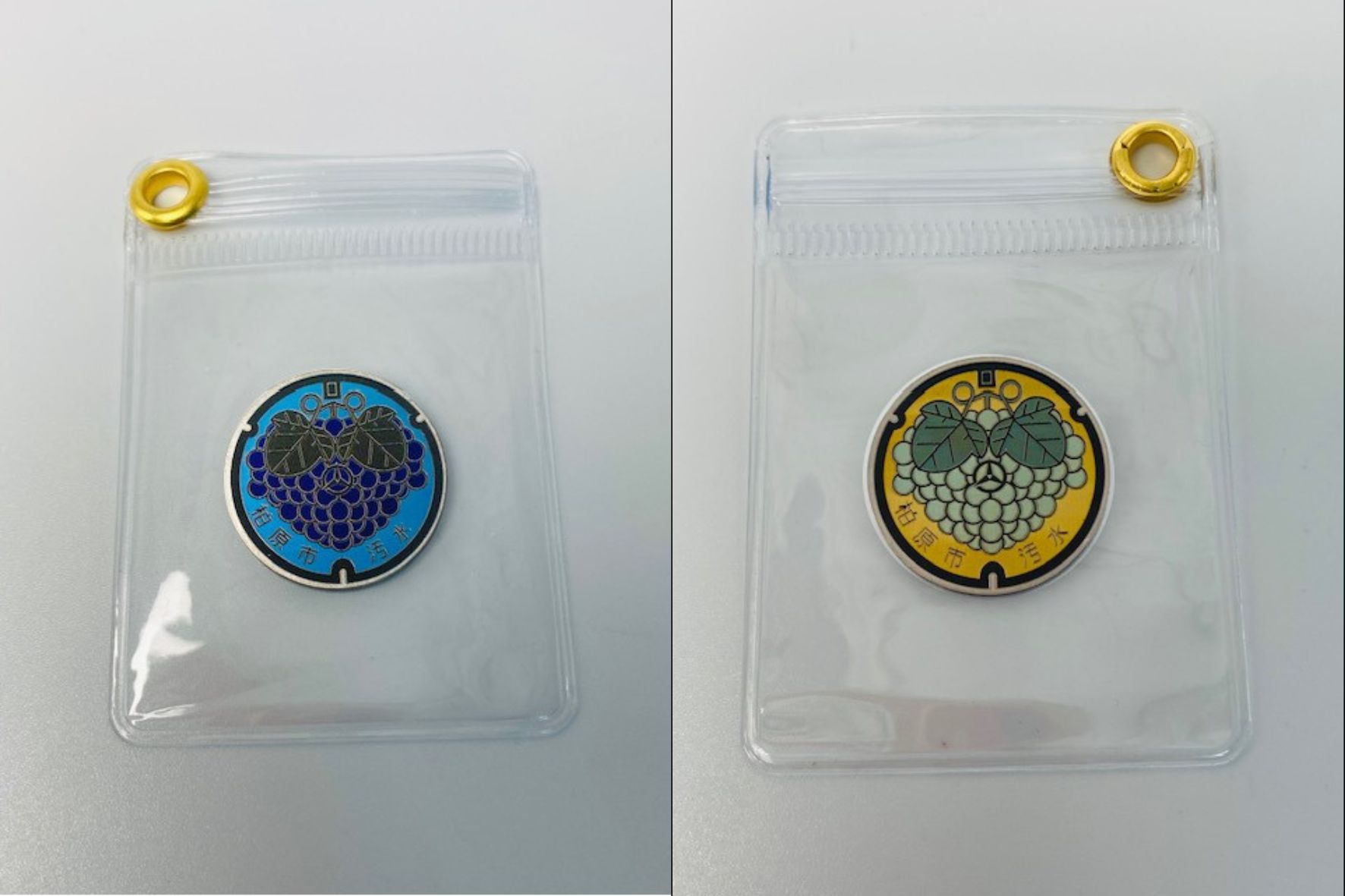 「柏原市特産品ぶどう」…柏原市の特産品である『デラウェア』と市の発展と親和を象徴した『市章』をあわせてデザインされたマンホールをそのままミニチュアにしました!「柏原市シャインマスカット」…柏原市の特産品であるシャインマスカットと背景には市内を流れる大和川が夕焼け色に染まるところをイメージしてデザインされています。