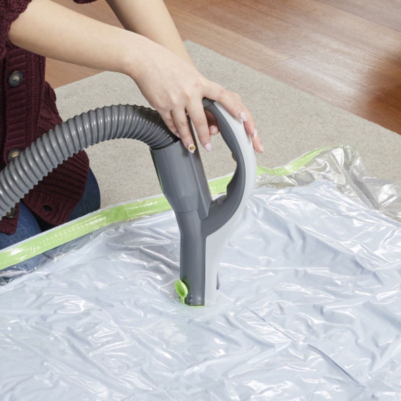 日本製バルブ式ふとん圧縮袋のセットです。圧縮袋には閉止スライダー装着済み。 ダブルサイズの掛けふとん(190cm×210cm)が1枚ゆったりはいります。 【底マチ付きの布団圧縮袋】 布団を入れると縦方向に立ち上がる底マチ付き圧縮袋なので大容量です。奥行き85cmなので、日本の押入れにスッキリ収まり、立体型に布団を圧縮できます。 【超薄型バルブ式布団圧縮袋】 厚さ11.5ミリの超薄型バルブだから圧縮しても盛り上がることがなく、ふとん圧縮袋を重ねて収納する時も邪魔になりません。 【空気が逆流しない簡単圧縮袋】 バルブの中の逆流防止弁の働きで、掃除機のノズルをはなすと自動的に空気の流れが止まります。吸引時の逆戻りで失敗することがないので、簡単・確実でしかも清潔です。 【簡単で確実な安心キャップ】 【しっかり装着済のスライダーで、簡単確実にチャックを密閉!】 【もしスライダーが外れても簡単に再装着OK!】 圧縮袋に装着してあるスライダーは外れにくくなっていますが、もし外れてしまった場合でも簡単に再度取り付けることができる安心設計の圧縮袋です。 【安心確実で使いやすいダブルチャックです】 ※画像はイメージです。 ※掃除機は吸込仕事率300W以上の機種をご用意ください。 ※一般的な家庭用コンセント式掃除機は、ほとんどが吸込仕事率300W以上ございますが、取扱説明書などで一度ご確認することをおすすめします。 ※ダイソン社製などの海外メーカーの掃除機に限りましては吸込仕事率が300W以下の機種が一部ございます。取扱説明書などでご確認ください。 ※ダイソン社製でうたわれている「ゴミ集じん率」は「吸込仕事率」とは異なります。 ※サイクロン式掃除機でも吸込仕事率300W以上あれば使用可能です。 ※ハンディータイプやスティックタイプ、コードレスタイプ、循環式の掃除機は使用しないでください。