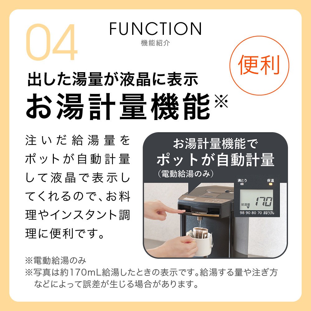 「蒸気キャッチャー構造」搭載により、蒸気を水滴に変え、ポット内に戻す構造になっているため、蒸気を本体の外に出しません。結露の心配がなく置き場所に困らないことに加え、うっかりと高温の蒸気にふれてやけどをするおそれもありません。(1)ポットが自動計量「お湯計量機能」(電動給湯のみ)表示は給湯量の目安です。注いだ分の給湯量の目安が表示されるので、お料理の下ごしらえやインスタント調理に便利です。※給湯する量や注ぎ方などによって誤差が生じる場合があります。(2)使い方広がる「コードレスエアー給湯」通電時は指1本で注げる電動給湯。電源のない場所では、プラグを外していても注げるエアー給湯でお湯が注げます。(3)2段階の給湯量切替「たっぷり&ゆっくり給湯」お料理には素早い「たっぷり給湯」、インスタントスープや紅茶など少量やじっくり入れたい場合は「ゆっくり給湯」。シーンによって給湯量の使い分けができます。