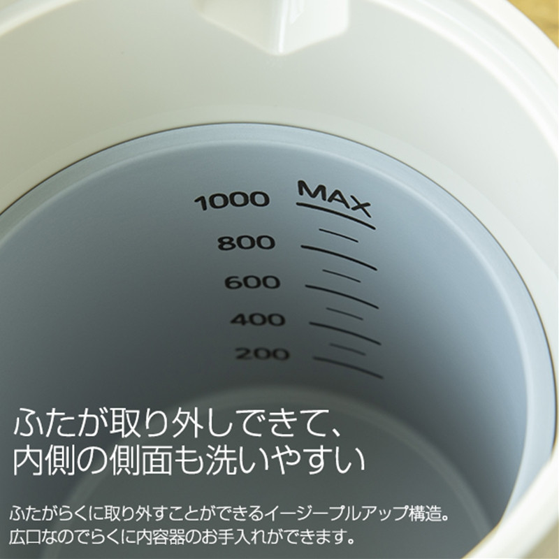 | 容量 | 機種名 PTQ-A100 色柄 (KO)オニキスブラック 本体サイズ(約)(幅×奥行き×高さ)15.4×26.4×21.2cm 本体+電源プレートサイズ(約) (幅×奥行き×高さ)15.4×26.4×23.0cm 本体質量(約) 1.1kg 本体+電源プレート質量(約) 1.3kg 定格容量(約) 1.0L 消費電力 1300W 沸とう時間(※1):カップ1杯(約)(※2)45秒 沸とう時間(※1):満水(約) 5分 電源 100V 50/60Hz コードの長さ(約)1.3m ※1:水温・室温23度。通電自動オフするまでの時間。 ※2:約140mL。 |