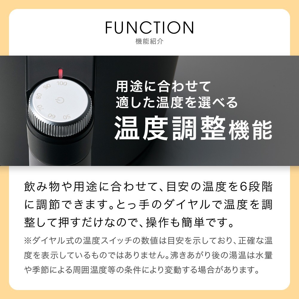 飲み物や用途に合わせて、温度目安を6段階に調節できます。とっ手のダイヤルで調節できるため、操作も簡単です。