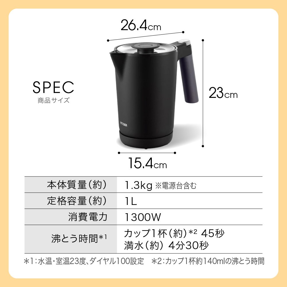 タイガー 電気ケトル おすすめポイント 小さく見えて大容量。たっぷり沸かすをお手軽に。 みんなのお湯をまかなえる大容量ケトル ・沸くの速すぎ!タイガー驚速(きょうそく)ケトル。約59秒*のスピード沸とう 1300Wのハイパワー電力とスピード蒸気検知により、カップ1杯分約140mLが約59秒*でスピード沸とう。忙しい朝や家事の合間、急な来客にも驚きの速さでお湯をすぐに沸かせます。 *水道・室温23度、定格消費電力において、カップ1杯分約140mLにおいて通電自動オフするまでの沸とう時間 自社測定法 ・たくさんのお湯を沸かしても、らくに持てる軽量&コンパクトのスゴ軽シリーズ お湯をたっぷり入れても軽くて使いやすい。軽量モデルです。 ・安心・安全設計 転倒お湯もれ防止構造*: 万一倒れた場合でもお湯もれを最小限に抑えます。 給湯ロックボタン*: ロックしておけば、万一倒れても注ぎ口からのお湯もれをおさえます。注ぐときはボタンを押して片手でらくらく操作。 転倒お湯もれ新安全基準*適合品 *J60335-2-15 2024 *給湯ロックボタンがロック状態になっていても、本体を傾けたり倒すと注ぎ口などからお湯が流れてやけどのおそれがあります。 省スチーム設計: 余計な蒸気が発生する前に電源がオフ。 蒸気がほとんど出ない*ので、蒸気孔から出る高温の蒸気にふれてやけどをするリスクを減らします。 カラだき防止: 万が一のときも安心。 カラだきを検知して自動オフ。 通電自動オフ: 沸とうすると電源が自動的に切れます。 ・使いやすい便利な機能: 注ぎ口カバー タイガーケトル初の注ぎ口カバー。 ロックボタンと連動して開閉することで中にほこりが入るのを抑えます らくらく着脱ふた ワンタッチで簡単にふたを取り外すことができます。 きれいな注ぎ タイガー独自のドリップロジック構造で狙った場所にブレずに注げて、お湯の飛び散りも抑えます。 広口内容器 内容器の奥までしっかり手を入れることができ、楽にお手入れすることができます。 【提供元】 タイガー魔法瓶株式会社